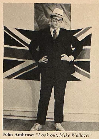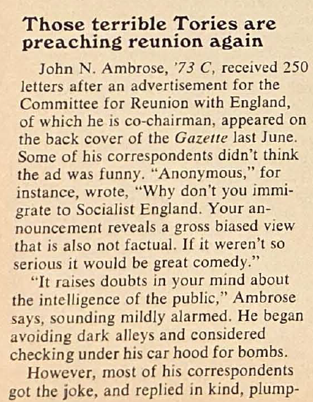 Penn Gazette – Part 3 True to its word, the Pennsylvania Gazette published another article on the Committee for Reunion with England in its November 1975 issue. Entitled “Those Terrible Tories Are Preaching Reunion Again,” the article featured a photograph of John standing in front of a British flag and an extended review of the first issue of The Tory Torch. The photograph was taken by David Gambill in John’s first apartment in Richmond’s Fan District. Above the British flag was a poster of poet T.S. Eliot, which was one of John’s favorite literary posters and thought to be appropriate since the American-born Eliot had famously become a British citizen in 1927. Read the full article. Our favorite paragraph from the Gazette’s article was one that showered praise on the satire in The Tory Torch and joined in the spirit of the humor: The other departments and stories in the first edition of the “Torch” further apotheosize its editors’ not inconsiderable talents in the areas of political satire, parody, intentional non sequitur, causerie absurde, irony, ignoratio elenchi,1 rodomontade,2 stichomythia,3 orotundity,4 manic sesquipedilianism,5 rant, bombast, and fustian.6 Next: To Tell the Truth irrelevant conclusion ↩︎boastful talk ↩︎A dramatic technique of short back-and-forth dialogue ↩︎pompous, bombastic ↩︎long-windedness; polysyllabic words ↩︎pompous ↩︎